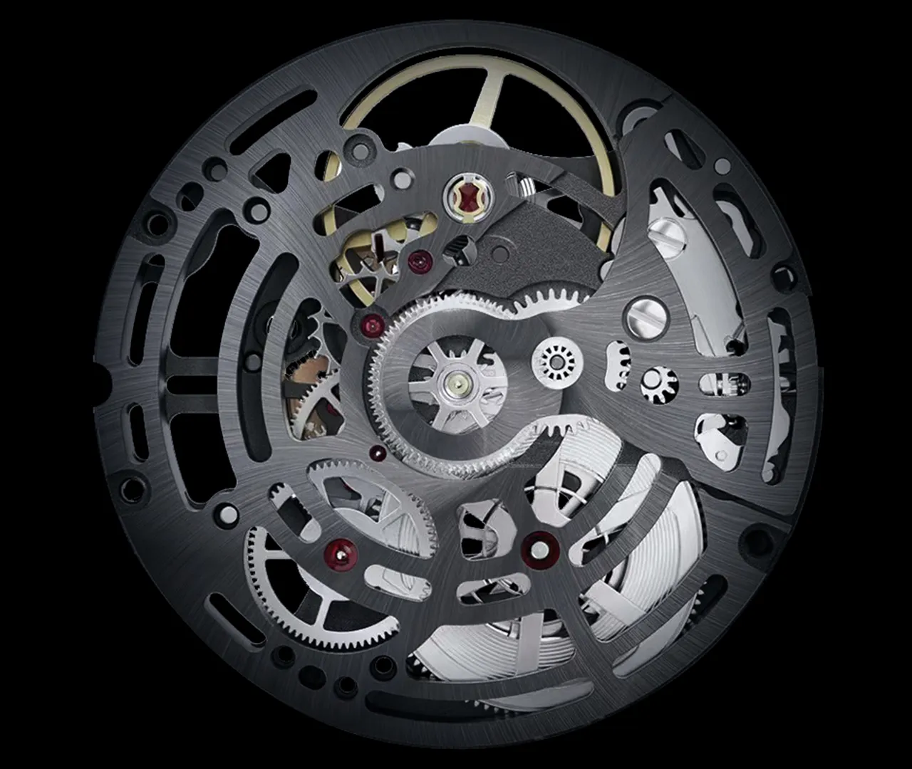 加えて、ルテニウムアンスラサイトメッキを施すことで、ムーブメント全体を丹念に磨き上げ、構造美として完成させています。