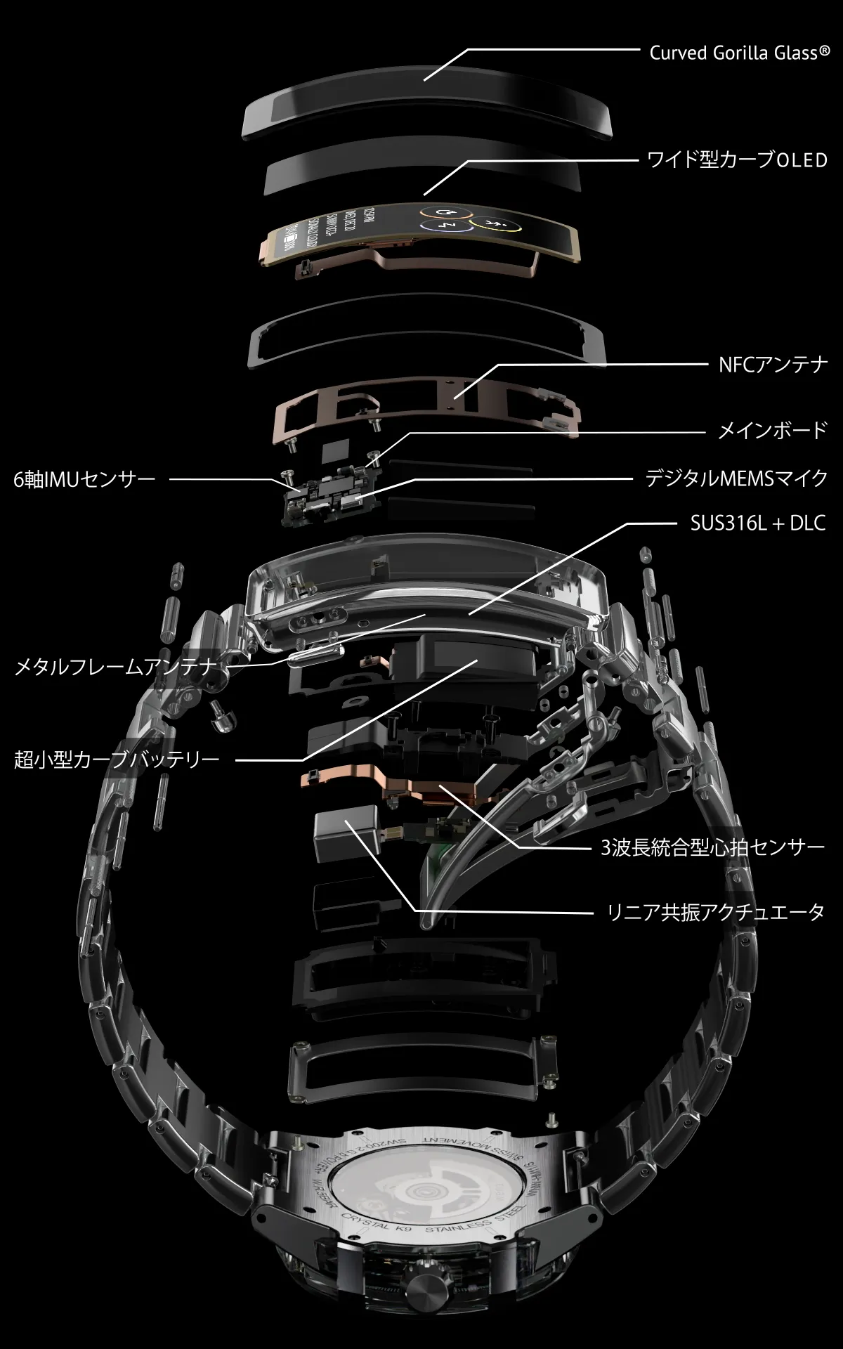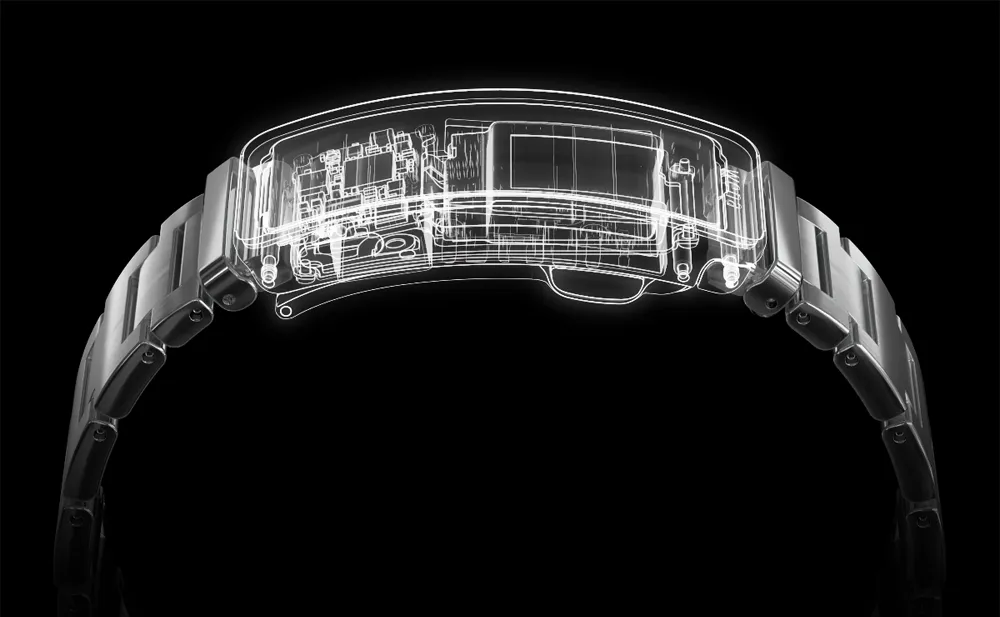 もはやアートピースともいえる、精密で美しい配列のフレキシブル基板、手首に寄り添うカーブバッテリー。