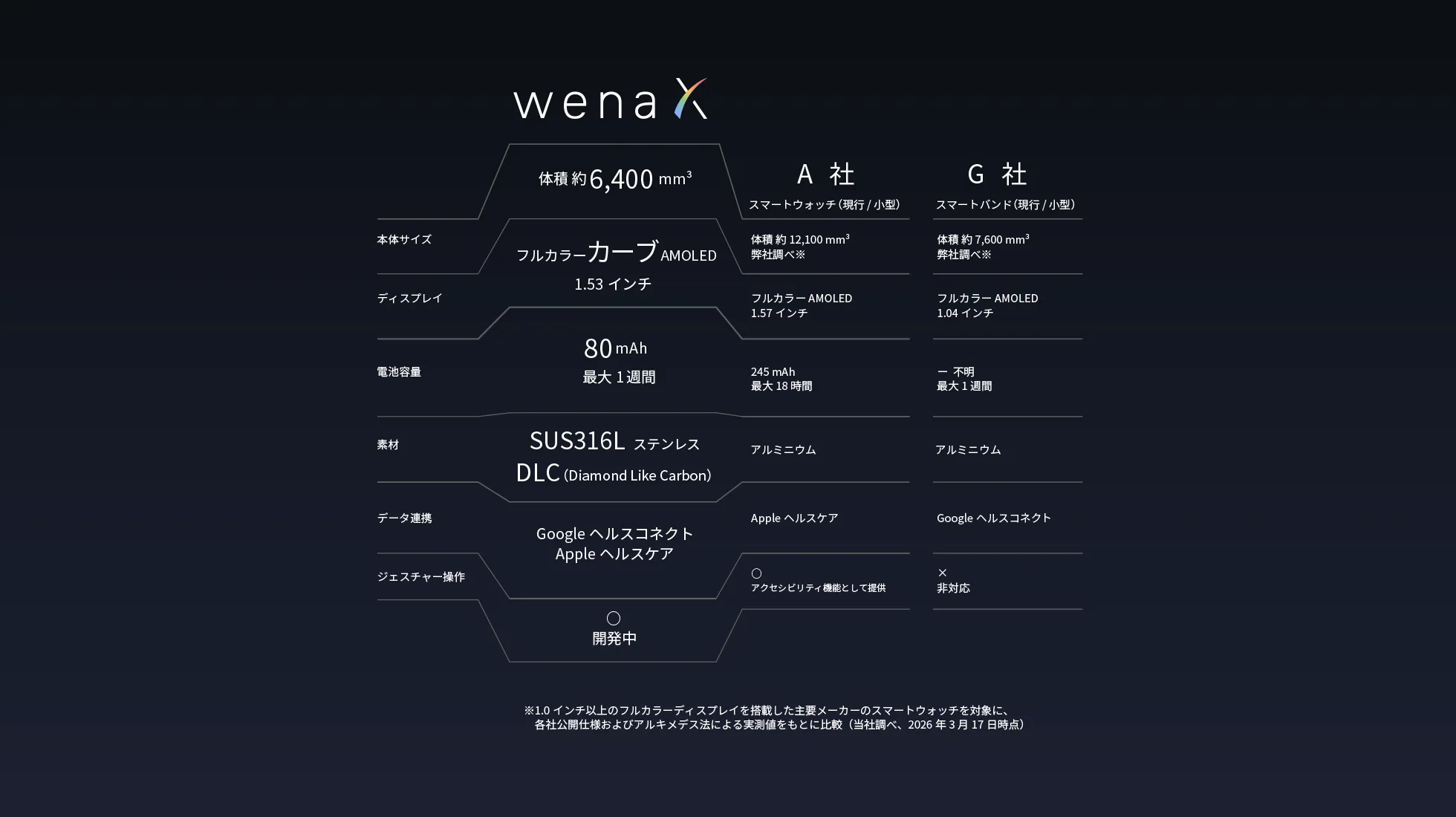 ※1.0インチ以上のフルカラーディスプレイを搭載した主要メーカーのスマートウォッチを対象に、各社公開仕様およびアルキメデス法による実測値をもとに比較(当社調べ、2026年3月17日時点)